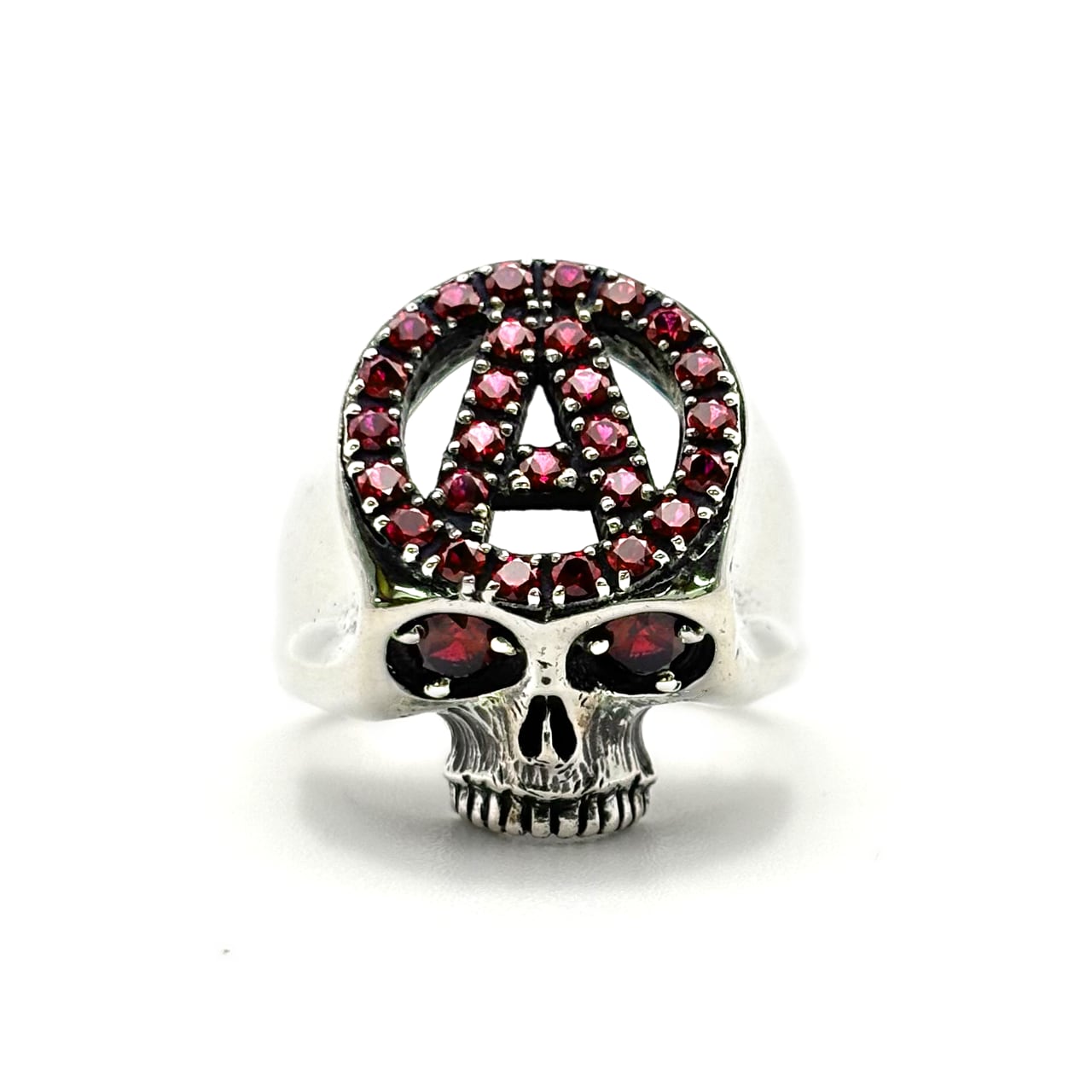 シルバー925の無骨なスカルリングに、アナーキーマークを刻印。