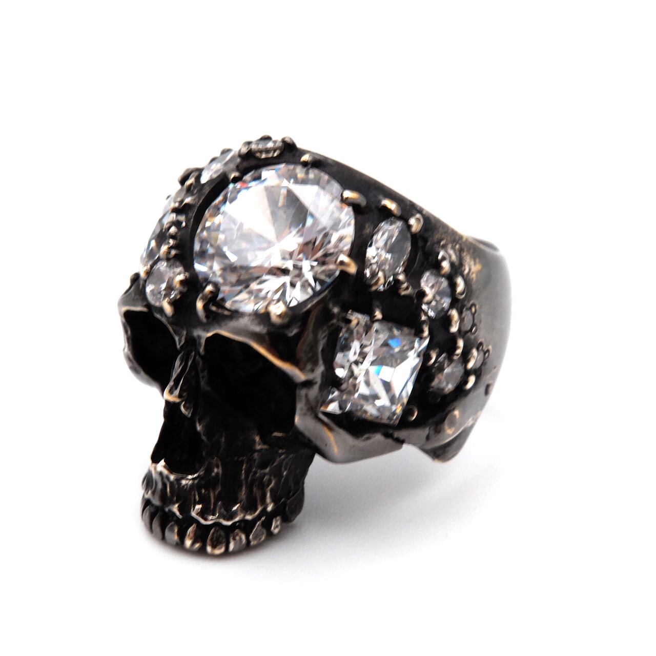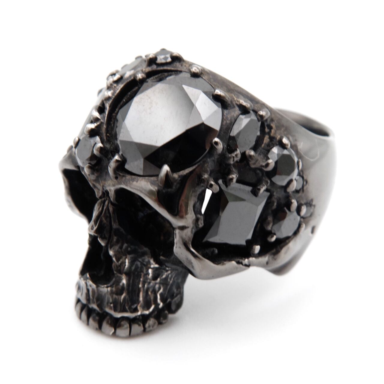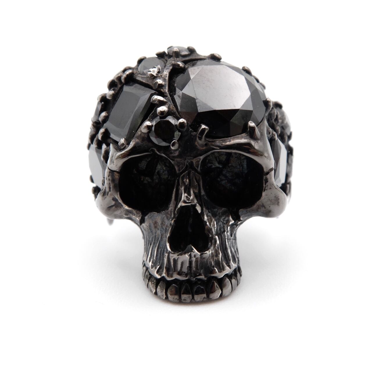 大小さまざまな形状のストーンを、80本もの繊細なツメで丁寧にセッティングしたアーティスティックなスカルリング。