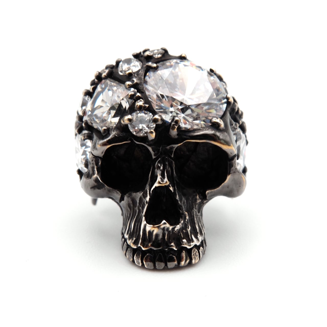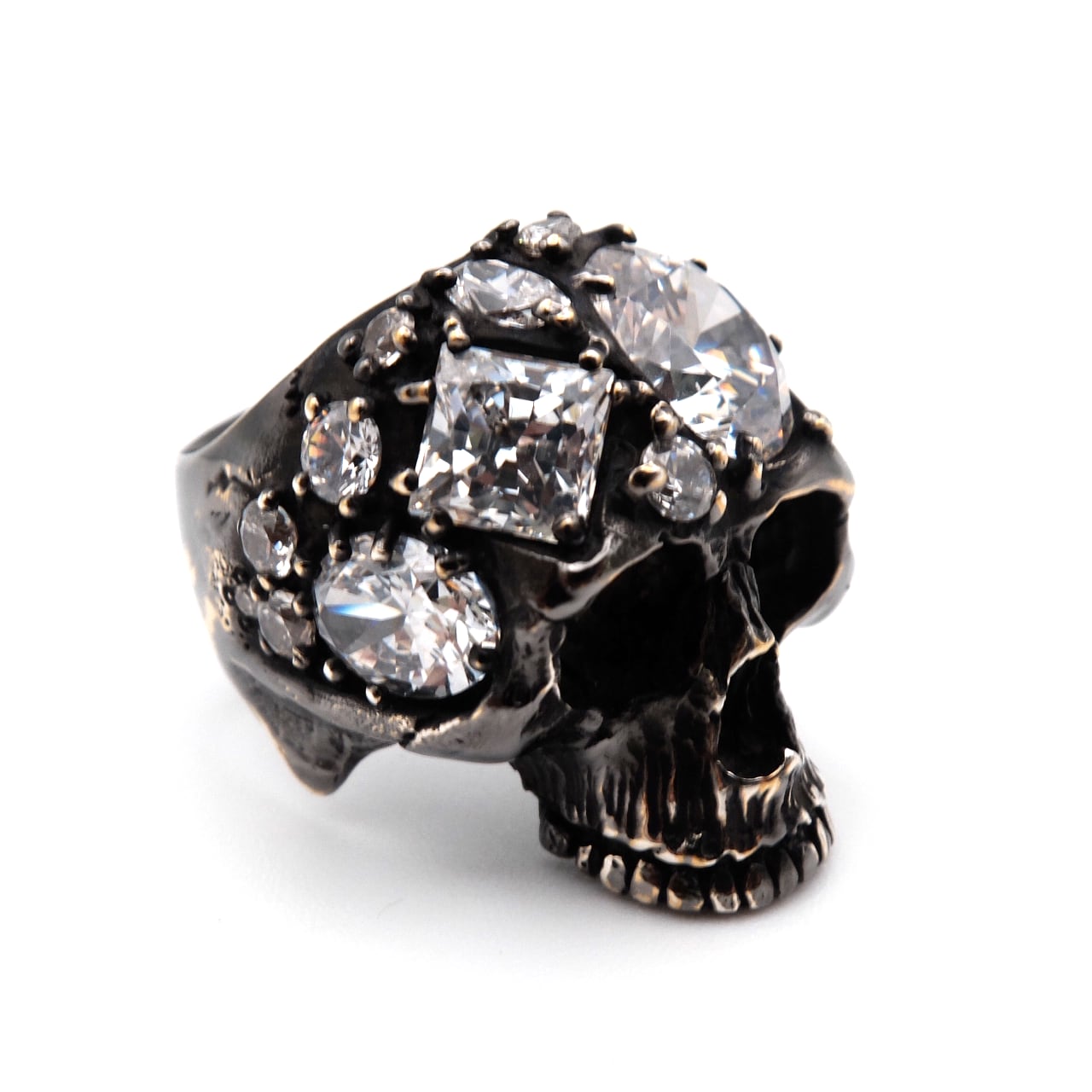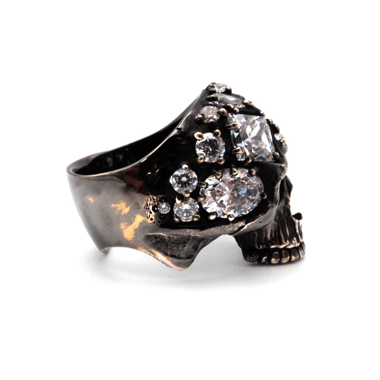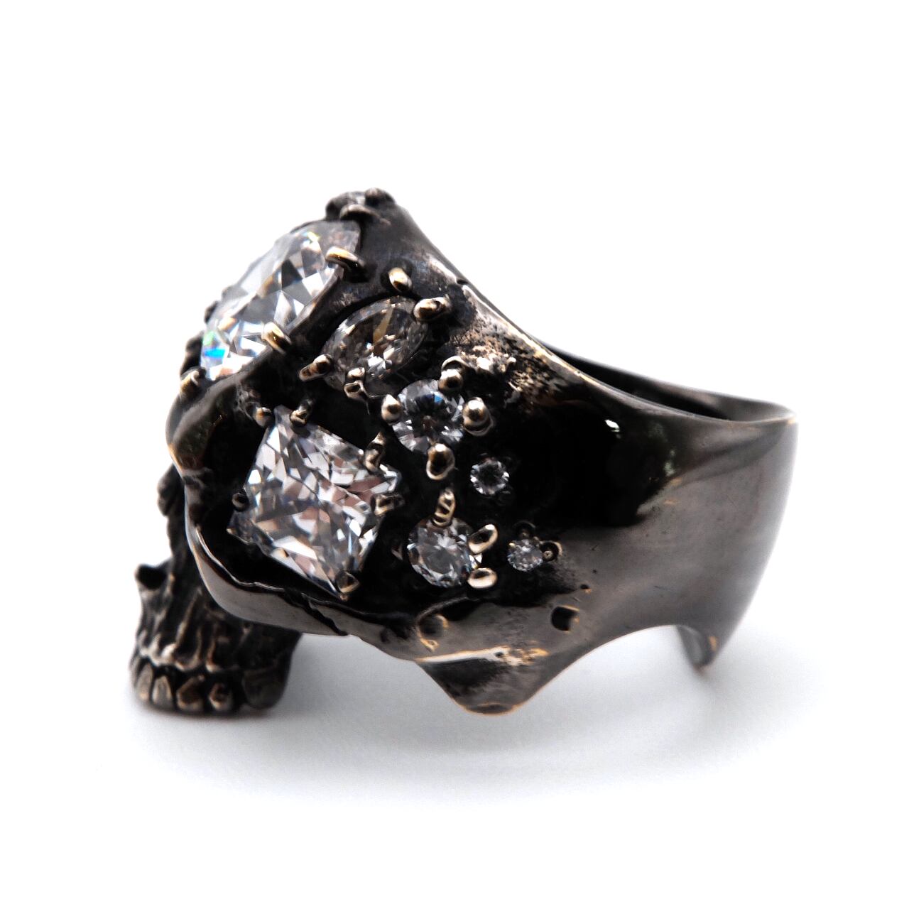 大小さまざまな形状のストーンを、80本もの繊細なツメで丁寧にセッティングしたアーティスティックなスカルリング。