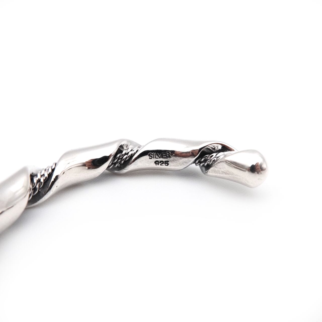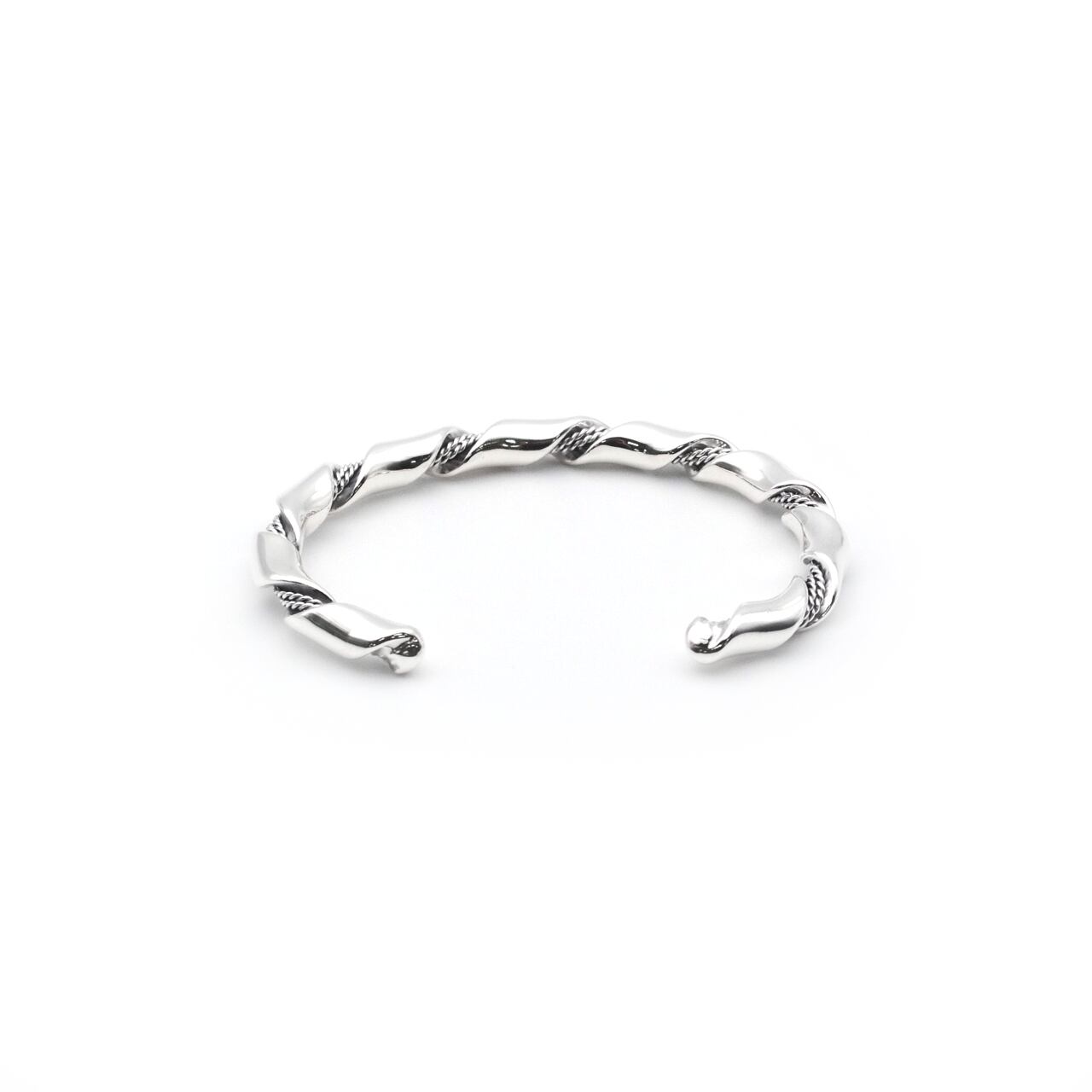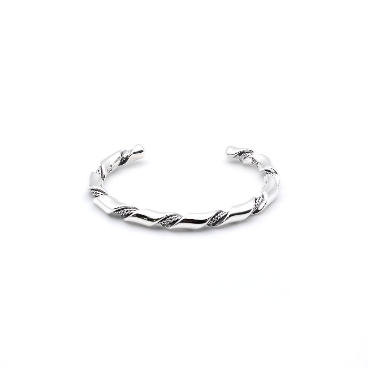 リボンとロープの異なる表情がねじれ合い、独特の存在感を生み出すシルバー925製バングルです。