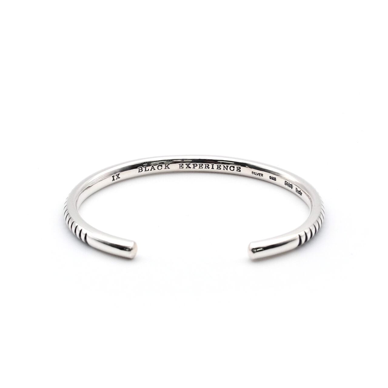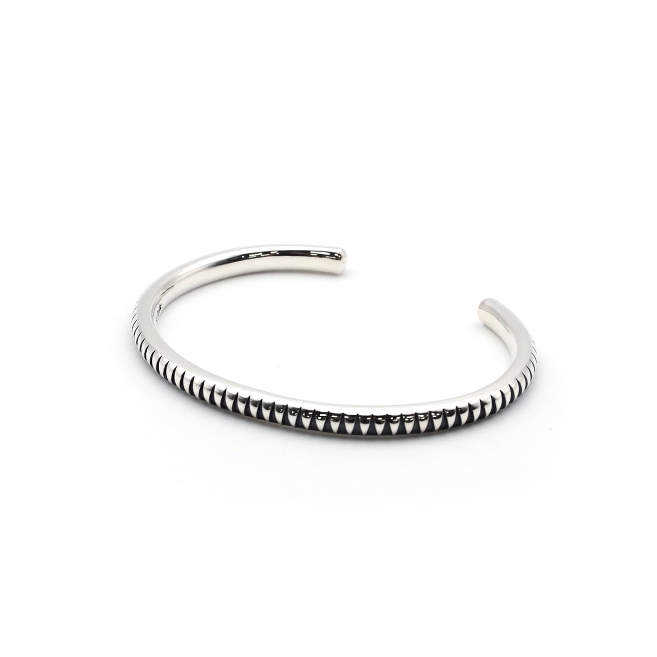 手首の曲線に沿って“DIA(ダイヤ)”状の極小スタッズを等間隔に配したオープンバングル。連続する面が動きに合わせて光を拾い、静かにエッジを主張する一本。時計や他バングルとのレイヤードにも自然に馴染むユニセックスモデル。