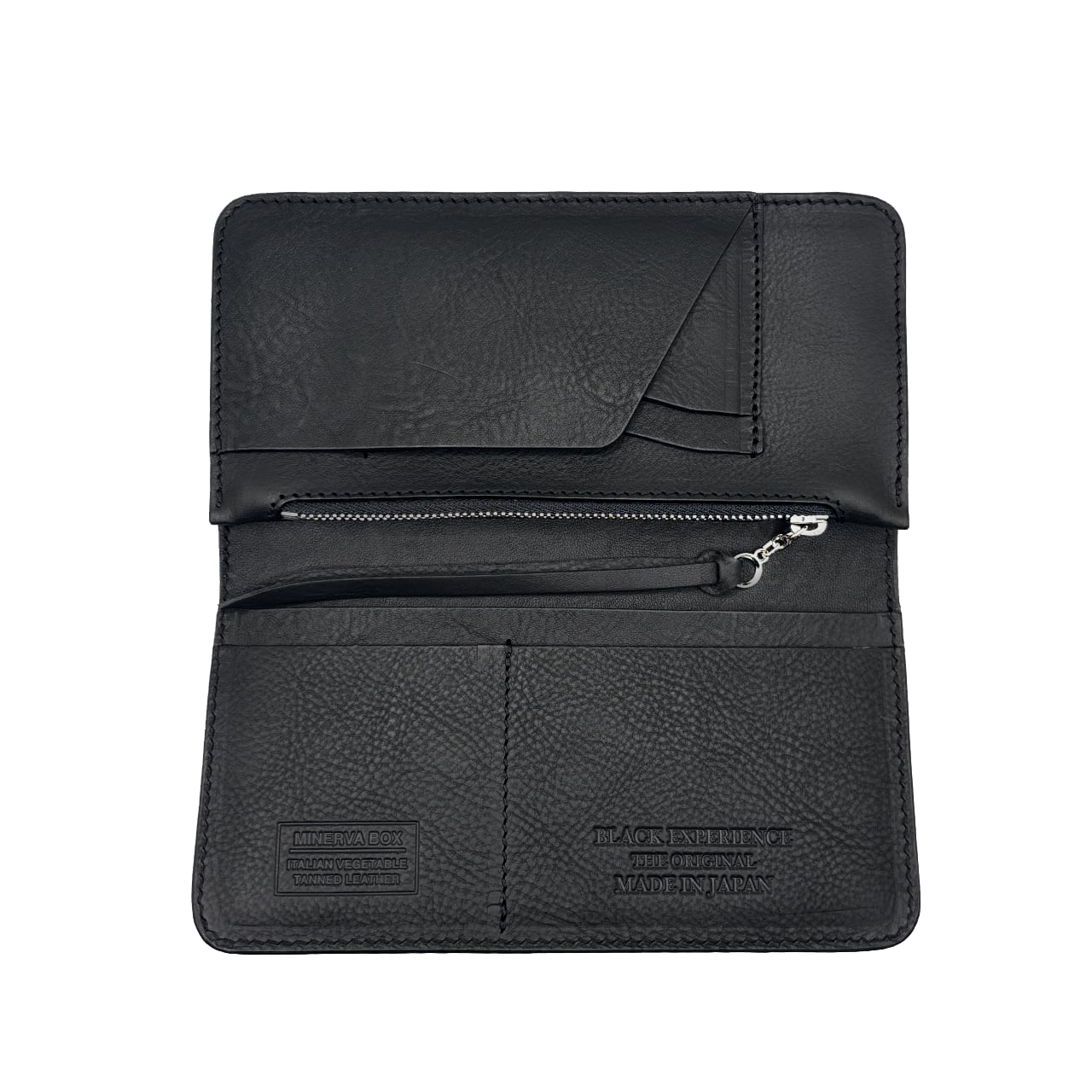 BLACKBOOTSを代表する名作「CORDOVAN LONG WALLET」の型をそのままに、外側から内側まで すべてをイタリア製ミネルバBOXで仕立てた特別モデル。