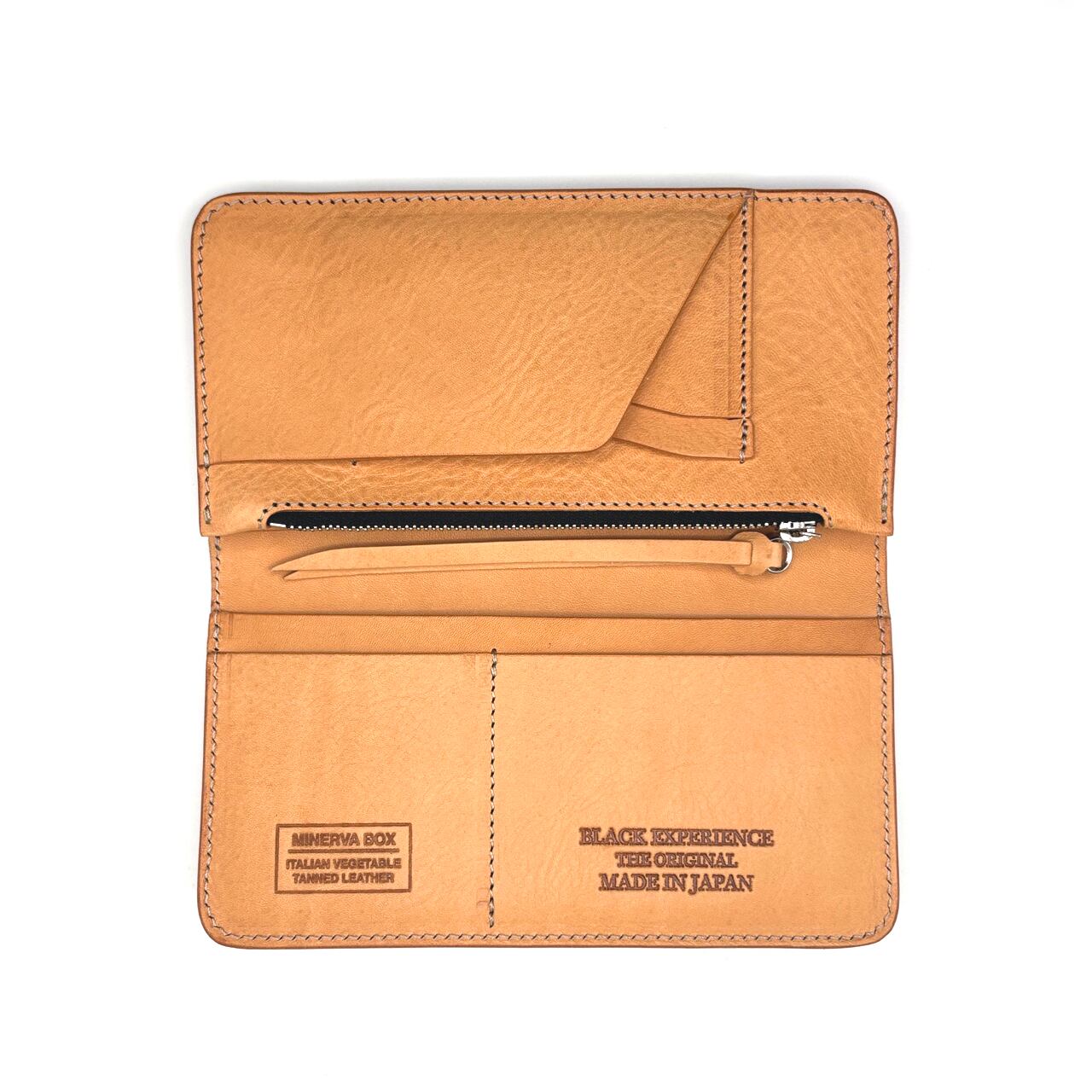 BLACKBOOTSを代表する名作「CORDOVAN LONG WALLET」の型をそのままに、外側から内側まで すべてをイタリア製ミネルバBOXで仕立てた特別モデル。